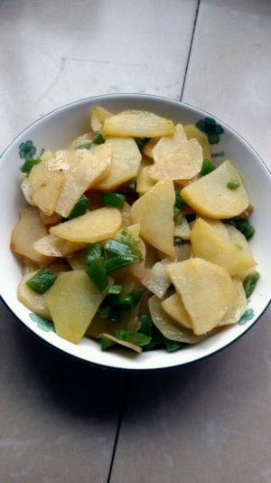 锅加适量油,微炸青椒,待香味溢出时倒入土豆片。