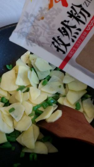 加入土豆翻炒几下,然后放孜然,椒盐,盐。
