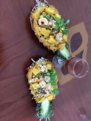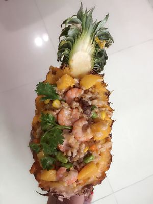 5 ,将锅里炒好的饭装进挖空的菠萝壳内,虾仁牛肉至上放置 菠萝块围圈,把装好的菠萝饭整个放入微波炉中烤3-5分钟后取出 ,这样可以使香甜的菠萝味浓浓地渗透到炒饭里。最后在菠萝饭上插上几根香菜或西兰花,就这样一份既美味又有营养的菠萝饭就做好了。