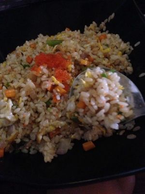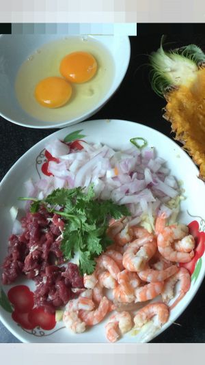 5,倒入油,待油锅冒烟再煎蛋液至金黄搅碎 倒入米饭翻炒,米饭和蛋炒蓬松后依次放入之前炒过的牛肉、洋葱、虾仁杂蔬和菠萝块略炒,然后根据自己口味加适量盐 肉粉 咖喱酱 蚝油 黑胡椒汁翻炒出锅即可。