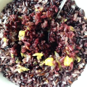 将菠萝汁倒入蒸好的血糯米饭中,搅拌