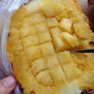 买个菠萝,竖切三分之一,不要切底。用勺子和刀将菠萝挖出来。