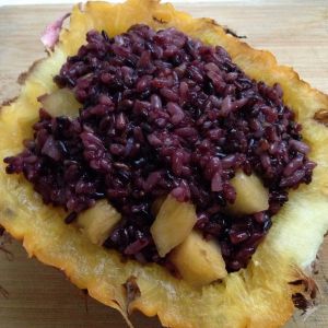 糯米饭趁热拌入葡萄干、枸杞、冰糖、菠萝果肉及果汁,拌匀后填入菠萝容器,上屉蒸20分钟即可。