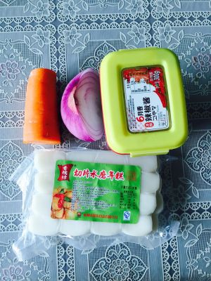 冷冻年糕洗净焯水三分钟煮软投凉,这样做出的年糕口感软糯Q弹。