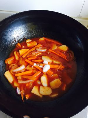 锅热放油,煸炒洋葱。洋葱稍微变软后加入辣酱和水。