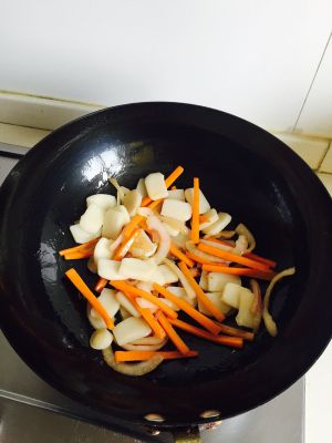 锅里倒入玉米油,放入洋葱爆炒出香味,再放入胡萝卜,把它炒软了。