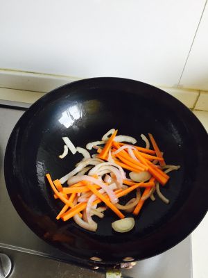 3起锅倒入油,8成热下入洋葱丝,胡萝卜丝炒出香味,放入辣白菜。