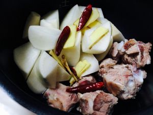 仔骨用开水过两次水去腥,白萝卜切成滚刀块,姜切片,干辣椒洗净,全部放入电饭锅