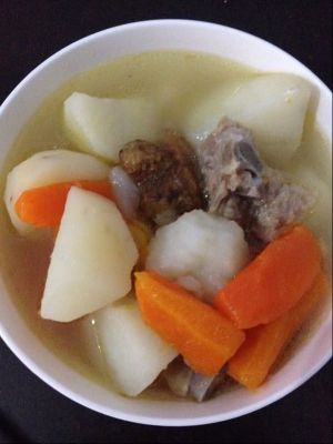 清水,加入所有骨头、适量盐、一小块姜。(我没有放很多盐和姜,以前每次做都放的多,但是每次味道都不出来,汤里有很大的姜味很苦,汤也没鲜味)大火煮开转小火慢炖30分钟后加入土豆、胡萝卜、玉米慢炖45分钟。出锅