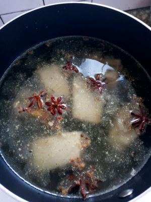 排骨切块,冷水下锅煮,不要盖上锅盖,用汤匙舀掉泡泡,血水
