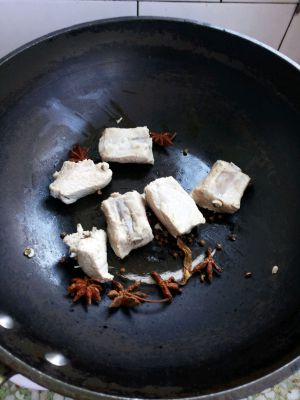 排骨凉水下锅开锅出锅后用水洗一下。 下锅炒后再放入花椒大料。