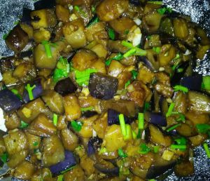 挤干茄子水分备用!热锅烧油,油热后下蒜,干辣椒段翻炒出香味,倒入挤干的茄子翻炒,再倒入调好的酱汁,煮到茄子软,起锅!