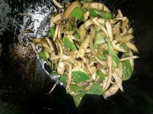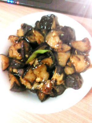 锅底少量留油,下葱姜蒜末,青椒段翻炒,下炸好的茄子,肉段后加入调好的碗汁,再翻炒几下出锅,完工。