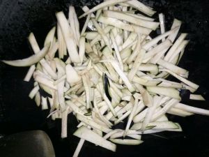 锅里放一些油,不用太多,茄子下锅翻炒,多炒一会。大约三五分钟,炒好后盛出来。