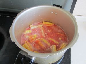 将蔬菜汁倒入装有刚焯过的排骨和玉米的高压锅中,大火烧开上汽,转为小火,五,六分钟即可;