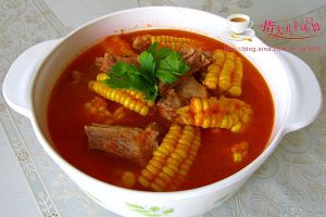 这样美味的带有蔬菜和肉混合香气的玉米排骨就制作好了, 如果喜欢多些汤, 还可以适量再加点水。