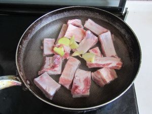 将切成块的排骨放入水中, 再加入两块姜片, 煮一下;