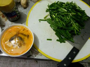 韭菜洗净整理好,切成段,鸡蛋打散,加入盐和料酒~料酒去腥,也让蛋炒出来很多~