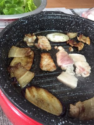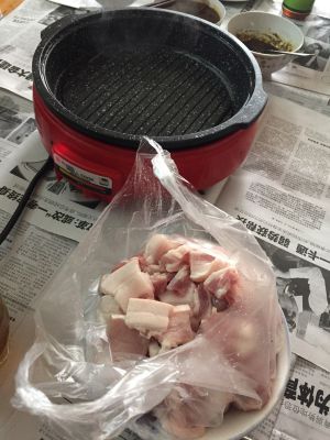 五花肉加酱放冰箱放置一小时后,放入烧烤盘。(没有烤肉酱也可用蒜泥加辣椒加盐味精油调味,这次是想换下口味)