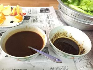 调酱料,酱料都混合煮一下,放点盐,油,煮一会待用。 孜然粉,辣椒粉混合,油过锅煮热,倒进来就可以了。