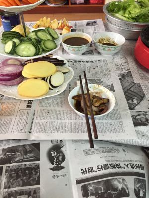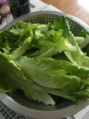 用生菜加蒜,加青椒,加烤肉包起吃。