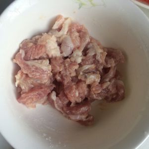猪肉切丝,放适量酱油、盐、胡椒粉、姜丝、蒜泥、淀粉拌匀,腌制十分钟。