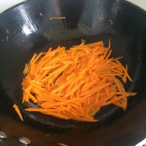 先倒入胡萝卜片,与肉丝翻炒。