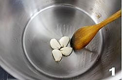 把蒜瓣用刀拍扁,锅中放两勺食用油,油热后放入蒜瓣煸炒出香味。