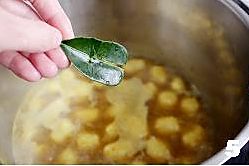 煮十分钟后放入4-5片柠檬叶子,柠檬叶子要先用手揉搓一下,搓柠檬叶子的时候脑子里浮现出冬阴功汤的画面,呵呵~
