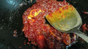 锅里放油姜片郫县豆瓣,小火翻炒香味出来为止