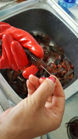 龙虾买回后加水、适量盐、醋杀菌8-1O分钟,清洗干净用刷子把龙虾腹部,头部刷洗干净,去虾头丶腮,虾线,尾部用剪刀剪一下方便入味。