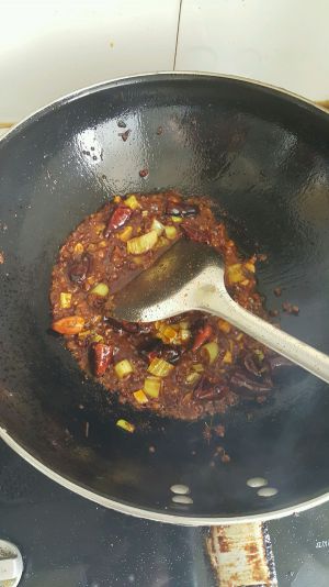 锅里放油(适当多放点儿)烧热后下葱姜蒜炒香,放辣椒、麻椒和花椒炒一下,加黄豆酱