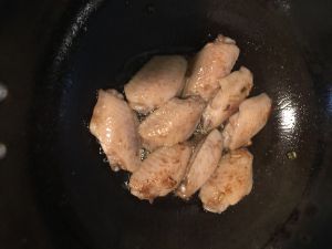 锅内放入鸡翅,加盐、料酒,生抽炒至上色。