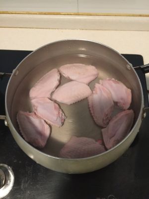 将鸡翅用沸水焯一下,使鸡肉紧质。