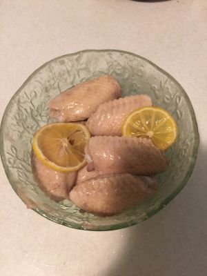 撒上鸡翅粉,腌制10分钟,我放了二片柠檬去腥