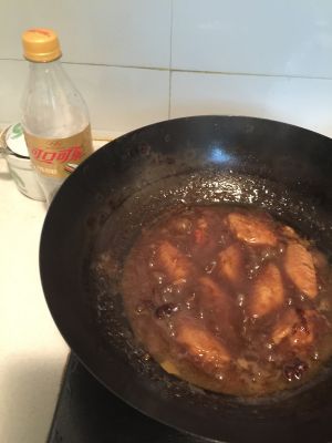 将鸡翅放入油中,待鸡翅表皮出现些许焦黄色,倒入可乐和少许酱油…