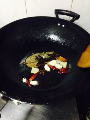 再放一些葱、姜、蒜、干辣椒,搅拌一下,盖上锅盖,转到小火开始等待吧。