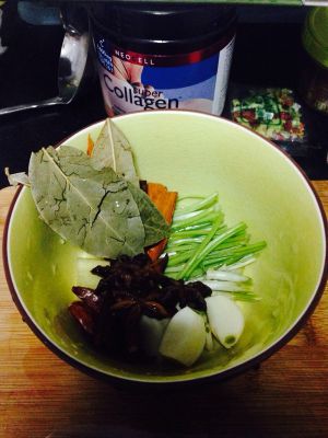 葱切断,姜切片,蒜,八角,香叶,干辣椒,桂皮洗净备用