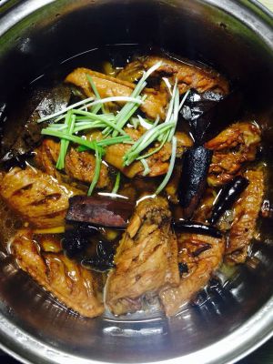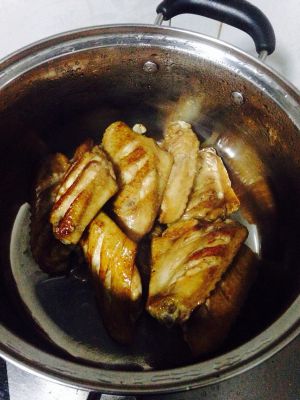 沥油,将煎好的鸡翅及之前捞出的调料放入煮锅,加入1大勺料酒
