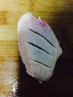 将鸡翅用刀划几道口子,放在锅中焯一下(要用凉水),水里放入适量葱、姜、蒜并倒一点料酒去腥。等水开后,看到水上漂这一层沫子就可以把鸡翅捞出来啦,控一下水。