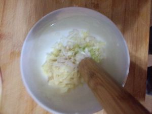 将葱姜蒜放小碗里用擀面杖捣成泥