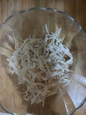激冷的鸡腿取出用手撕成鸡丝。