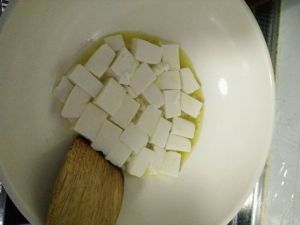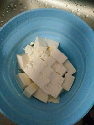 将豆腐切成小块,放在淡盐水中浸泡。