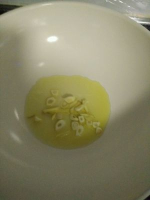 锅中放油加热,放进切片的蒜瓣翻炒。