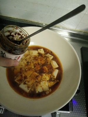 放酱料(老干妈,豆瓣酱,豆豉酱任意),我放的是饭爷(林依轮出品)~量以豆腐完全染色为准
