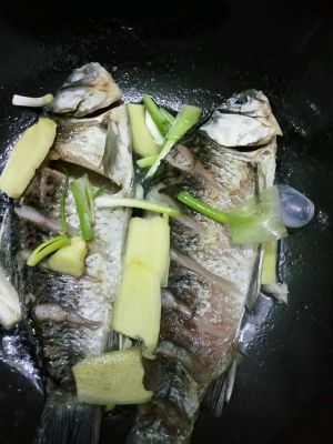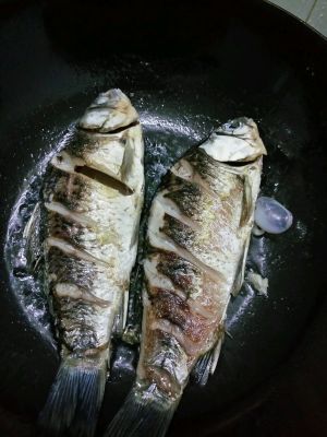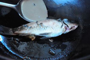 热锅冷油,这样不会粘。 锅中倒少许油。把鲤鱼放进锅里两面煎一下。