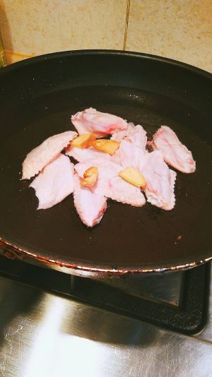 然后把鸡翅放入锅中两面煎至金黄,放入葱姜蒜