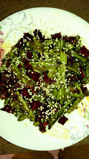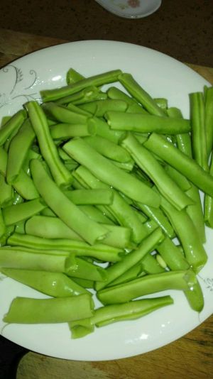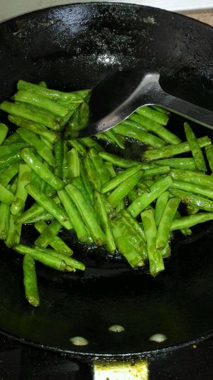 首先放适量花生油,中火将四季豆煸炒至微焦黄熟透,装盘。一定要熟,不熟的四季豆有毒!