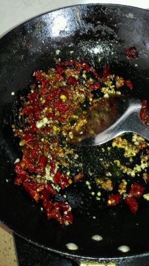锅中留少许油,放入蒜蓉,干辣椒和花椒,炒出香味