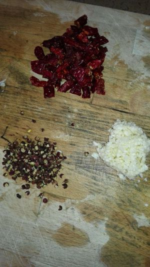 将5、6 瓣大蒜剁碎,干辣椒剪成小段,花椒根据个人口味备好。